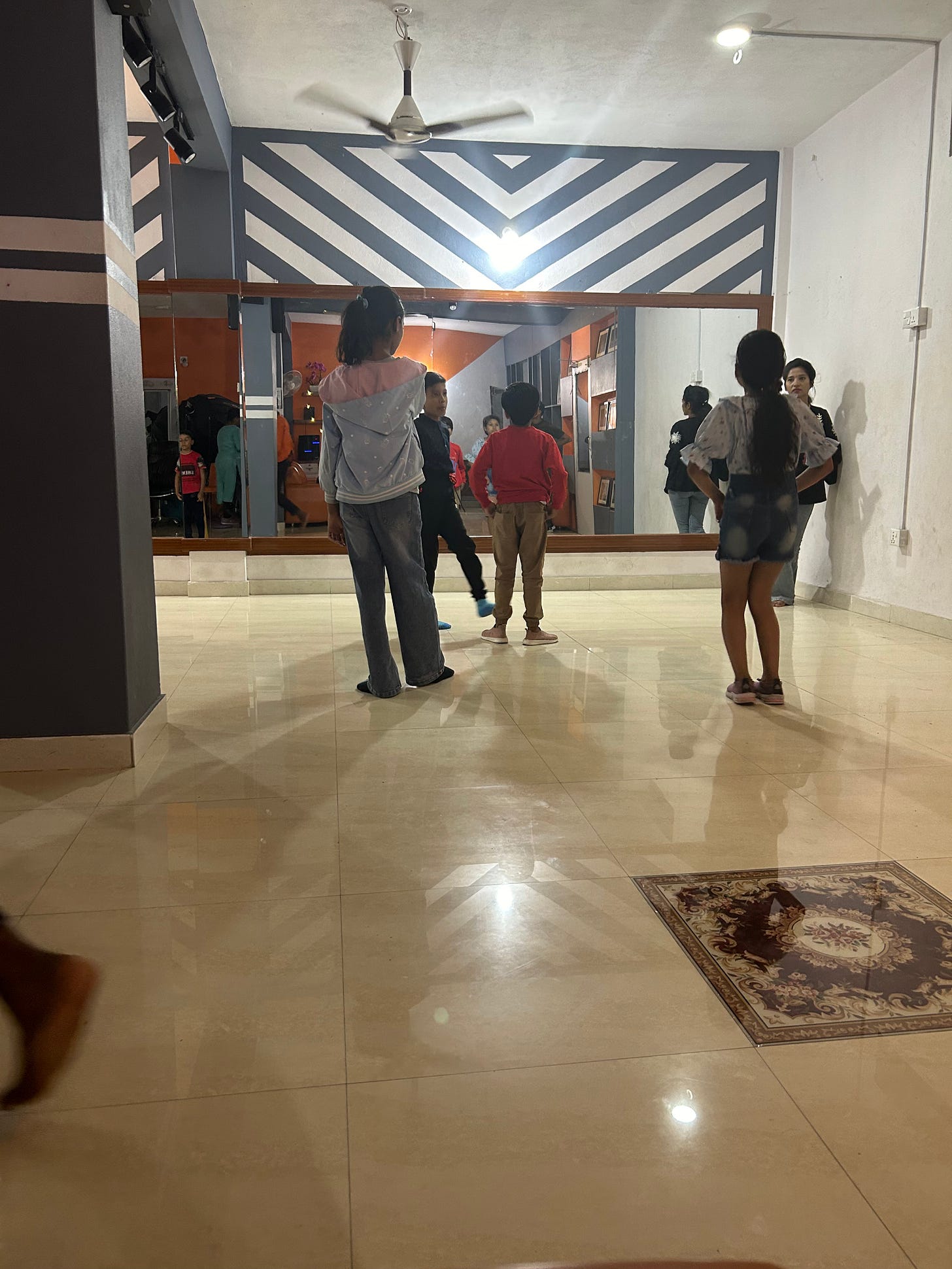 Late last week I found out that Mona Lisa has a dance studio! She invited me to come one day last week and I went and got a sneak preview of the cultural dance performance that happened at ICC over the weekend. On Monday they told me to come to the studio again after work, and since I have nothing to fill my time from 5pm on and no friends besides the Sah’s, I decided to join! I was very tentative walking in because I didn’t see Mona Lisa, Jahnavi, or Arav through the window. Though my plan was to stand outside until I could track one of them down to make sure they were actually coming, I think the dance teacher must have recognized me (can’t imagine how!!) and called me to come in. Pretty much every time I show up somewhere by myself I’m not sure if I’m supposed to be there, but without fail everyone always makes me feel so welcome. The Sah’s did show up a few minutes later and then I felt better because at least I knew I had someone to talk to. Also, the dance studio doubles as a photography studio for Mona Lisa’s brother, so I had him to talk to as well. He is super friendly and is the one with the really cute baby I met a few weeks ago. Anyway, after I arrived they had me join them warming up. Everyone in the class was also a child so that was interesting. After warm ups though, the teacher made everyone go take a break and he walked me through the choreography they had learned thus far. I wasn’t expecting them to literally pause the whole class for me to learn, but again, these people are genuinely so welcoming and inclusive that I should have known they wouldn’t let me start behind. Since they had learned quite a few steps and the song is Hindi, it was a little hard for me to remember the sequence, but it was a children’s class so I wasn’t too worried about looking stupid. Thankfully they at least count in English so I had that going for me. The studio itself isn’t too big, but there are always people arriving and hanging out and kids playing on the side, if not a full other teacher instructing someone in the same room, which makes it very casual and fun.